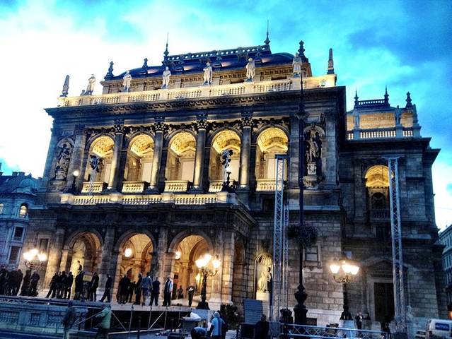 饭后决定步行去瓦茨大街,先找个换汇点装备好万元大钞,再到多瑙河畔看看布达佩斯夜景。走到地铁M1线Opera站附近就能看到歌剧院,我们路过时歌剧院门口正在搭建看台,不知有什么活动。