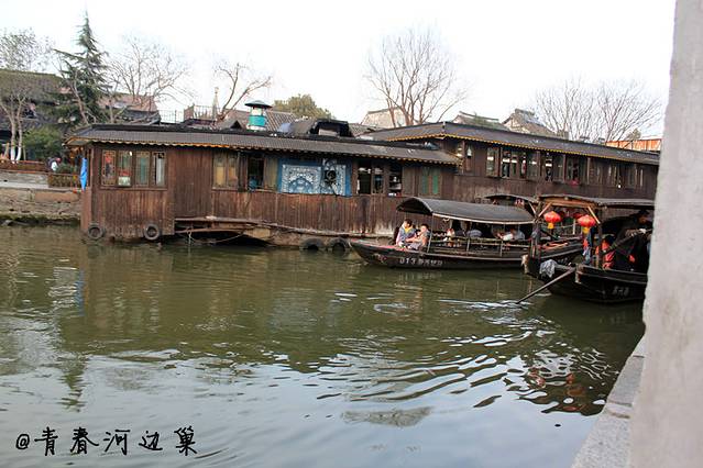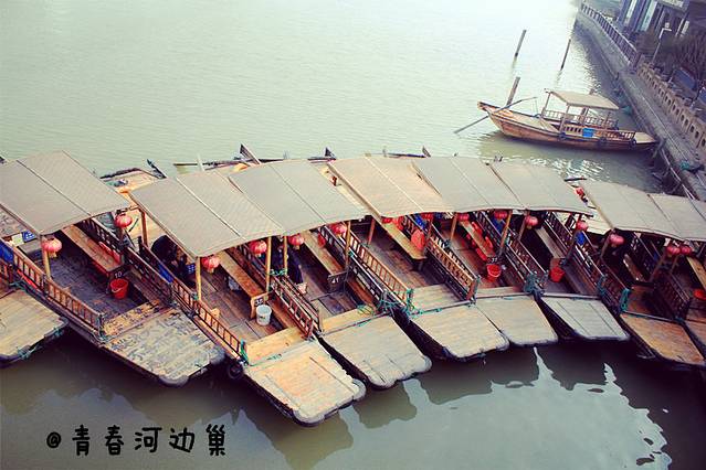 好好的一面墙被写成这个样子,本来想在这里拍照,但是也没有过多停留。小锟指着河中央的船,想要去坐坐看。想想江浙一带的古镇总是去,还没有带小锟去坐船。都说西塘的夜景很美,现在虽然还没有天黑,但是已经傍晚了,已经开始浮现出夜景的美。既然小锟提出来了,那就去吧。