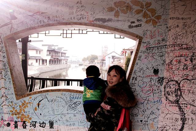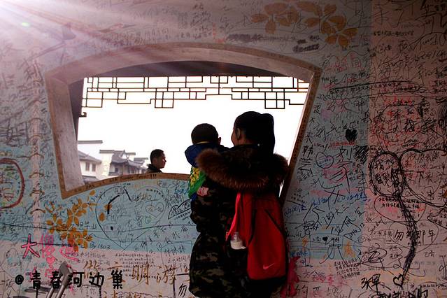 我们到的时候是下午,安顿好以后迫不及待的就去景区游玩了。繁华的街道,曲径通幽的小巷,一切的景致我们都非常喜欢。小锟象一只小鸟,一路上蹦蹦跳跳的,走到一个码头的时候,经过一面墙,通过这面墙可以看到远处的河流。只是这面墙被游客写满了字,大体都是:“到此一游”的字样,国人的素质在这一刻真的觉得有些过分。