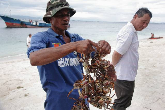 三宝颜的萨马尔族居民住在海边,靠打鱼为生。他们的木屋搭在海上,下面用几根插入水中的木柱支撑。他们出海打鱼和走门串户,都依靠“邦卡”(小船)。较大的渔村也有路,实际上是一座用木板搭起的很长的桥,离海面两三米。当地人把他们这种村子叫“水上部落”。但这些年来,菲律宾政府帮助他们盖了不少新居,“水上部落”正在以新的面貌出现。图为当地人向我们兜售小螃蟹,据说这里有美味的人妖蟹,不知道是不是这种。