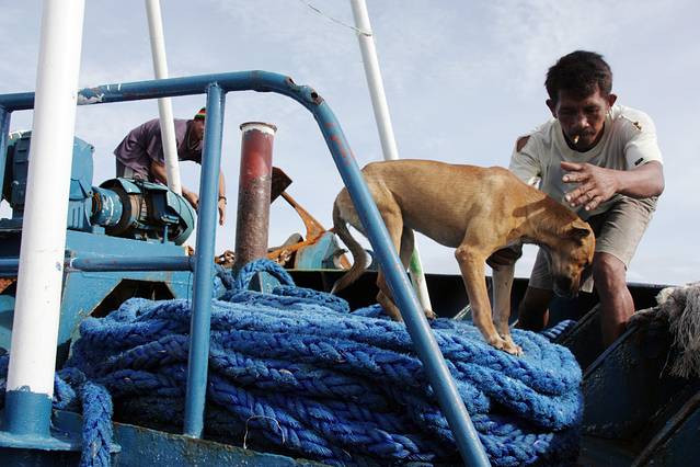 船员喜欢养狗,好像全世界的船员都喜欢在船上养狗。而且人和狗之间的感情非常深。