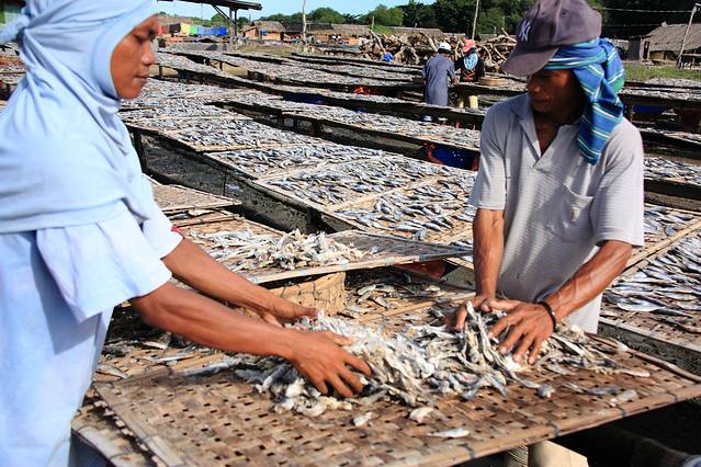 几十个晒鱼场工人,头顶烈日,忙忙碌碌。动作很慢,有说有笑,井然有序。老板来了,他们也不怕,依旧说笑。