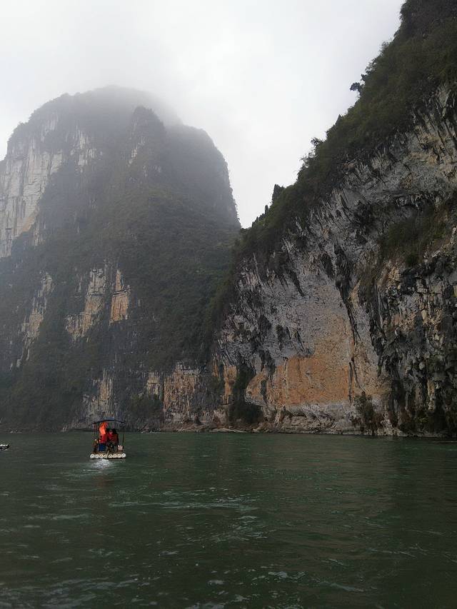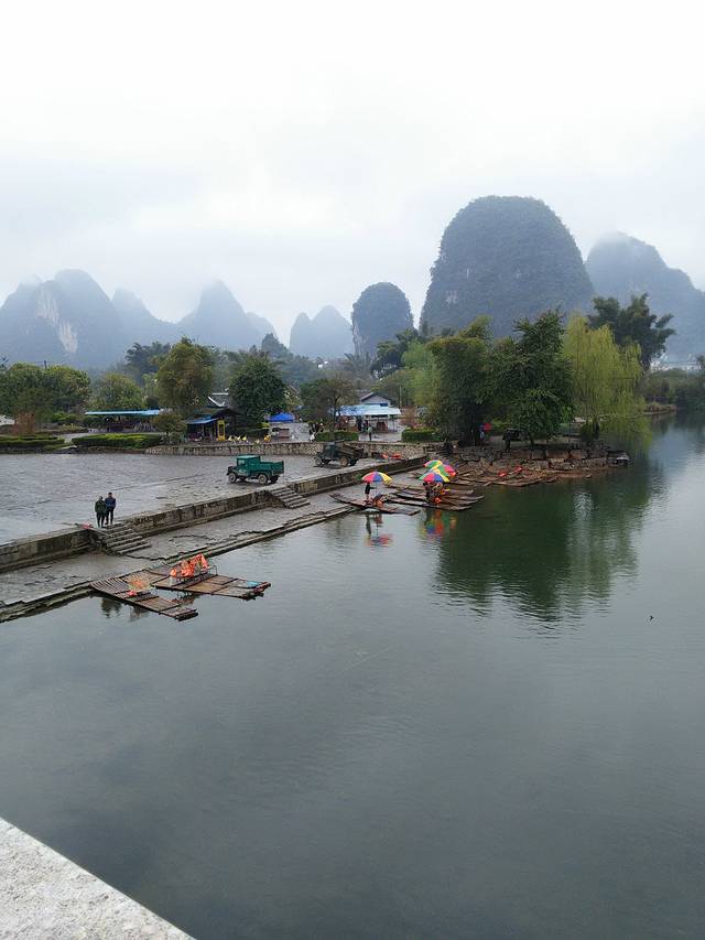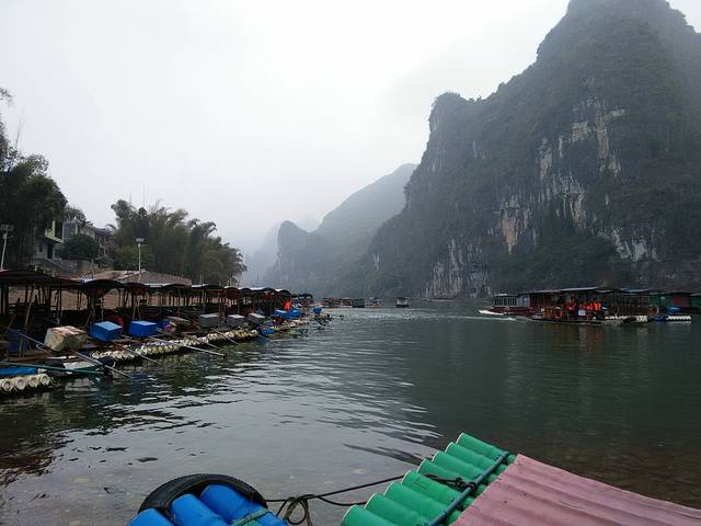 昨晚在电话里面预定了游漓江的竹筏,350两个人。竹筏廖师傅联系了司机师傅从青旅门口接我们去杨堤乘船,25/人。竹筏漂的票价可以从网上订,但淡季出行的话最好可以在当地问旅馆前台或自己找师傅电话谈好价格。10:30~12:00好像是停伐时,可以根据自己的选择自由决定上午去还是下午去。如果没有司机接的话就要自己去车站乘去杨堤的车然后转公交才能到码头,这样的话还不如报一个一日团。