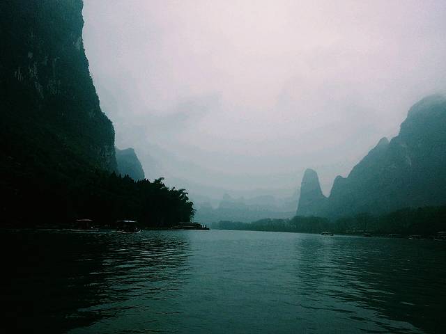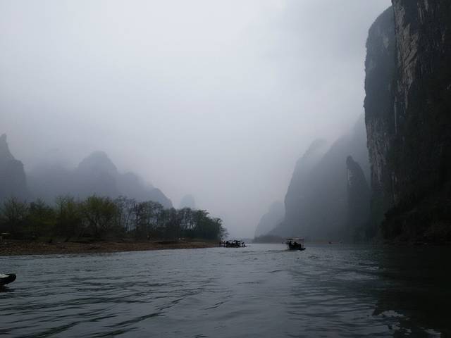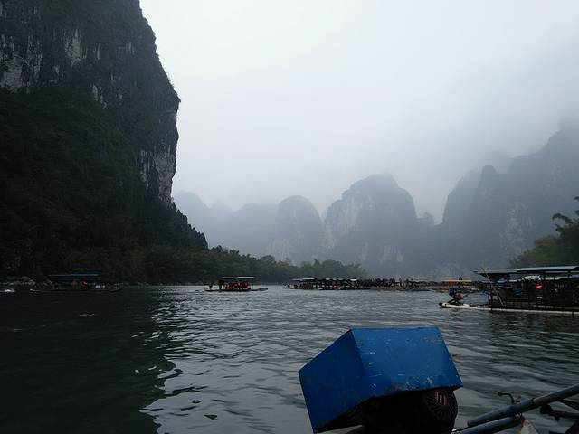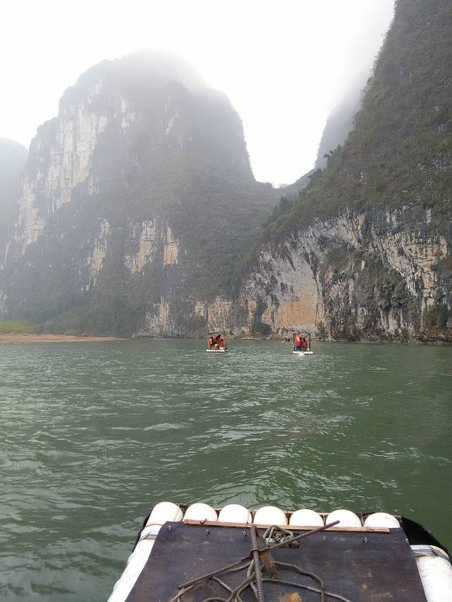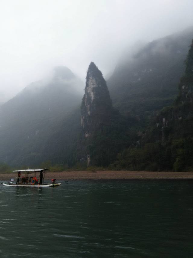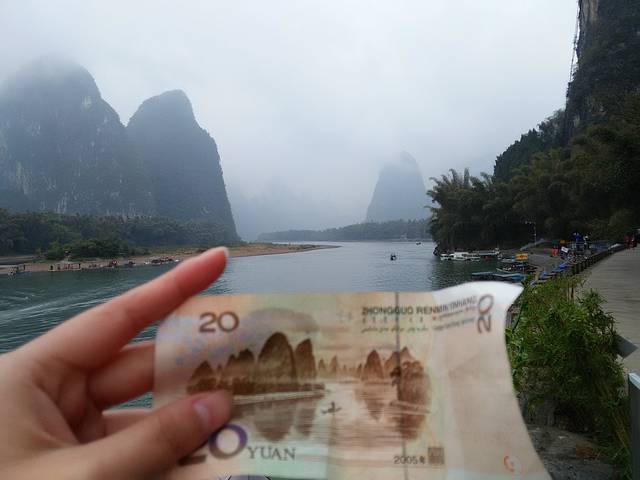 在些许小雨中泛舟在漓江真的感觉很自在舒畅,像一不小心闯入某个桃源一样,小舟拨开轻柔薄雾缓缓在仙境中行进。在美的旅途终将结束,竹筏的终点是20元人民币的背景大码头,可惜雾气迷漫使我并不能完成和实景无缝衔接的照片,算了~来过已心满意足。
