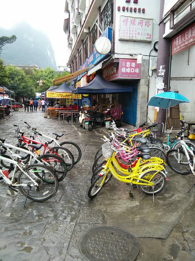 早八点在大油条吃过早餐后我们就去租山地车,今天的行程是骑行十里画廊!怎么说来大阳朔不体验一下骑行简直对不起自己!所以说就算天气还是时不时来点小雨还是歪歪扭扭的骑上了山地车,车子是30/天,押金是200,并且要扣押身份证一张。大家可以提前在网上或者是旅馆门口打听好比较好的租车行,本大神精病【划掉】就是在西街边随便找个租车摊摊租的车,后座好硬!!!一天下来屁屁好痛嘤嘤嘤......