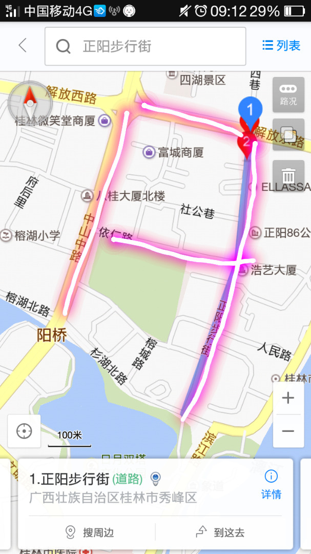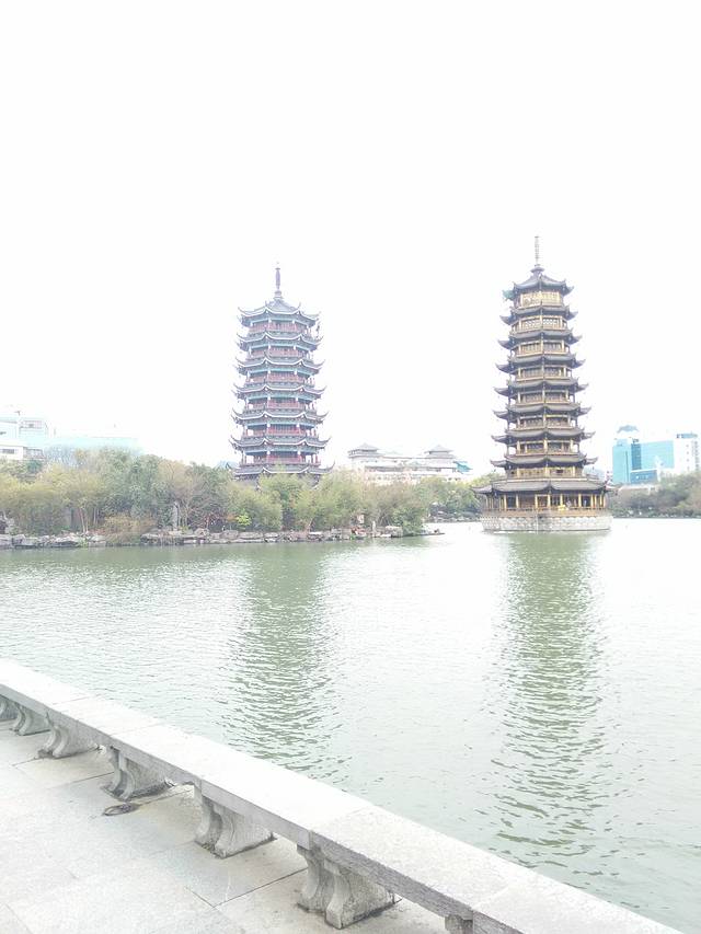 正阳步行街走到尽头就是有日月双塔的杉湖,从杉湖直走过去就是桂林市徽象鼻山。