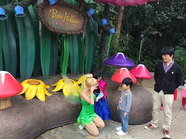 花仙子精灵可要提前去拍照哦,我们就是等不了五分钟她的休息时间去玩其他的啦,到下午来找就没有啦,记得要认真看迪士尼的表演时间表,很重要的