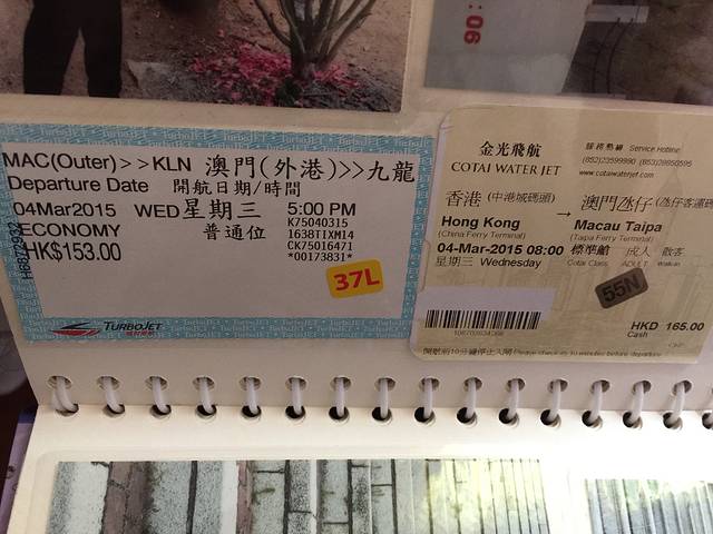 5、港澳船票去金光飞航165港币,回来喷射飞航153港币到九龙,去时到中国客运码头现买的,其实不用网上买,买到港澳码头的比较便宜到dan仔的比较贵,所以你们可以买喷射飞航到港澳码头的去香港。记得下午五点之后算夜航价格都很白天的不一样,还要买的是标准舱或叫普通位。
