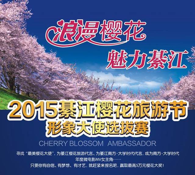“樱花旅游节形象大使”选拔赛根据本次活动主办方介绍,樱花旅游节形象大使的选拔,3月9日开始面向綦江人们和綦江大中专院校师生,将会选出冠亚季军和10名优秀奖,冠军将会成为綦江2015年樱花旅游节形象代言人。
