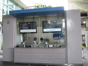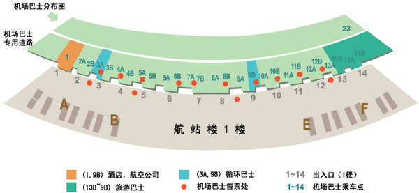 乘车点位于航站楼1楼到达大厅的外面。由于乘车点比较大,所以根据路线不同分为东面和西面2个。一般而言,可以直接乘坐需要的巴士,但是在高峰期,由于乘客较多,建议在售票处买票,以保证乘坐时有座位。