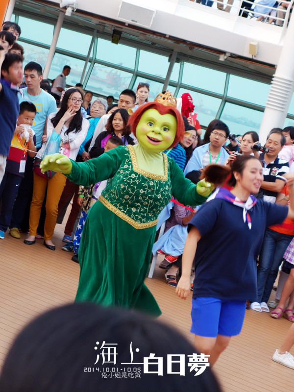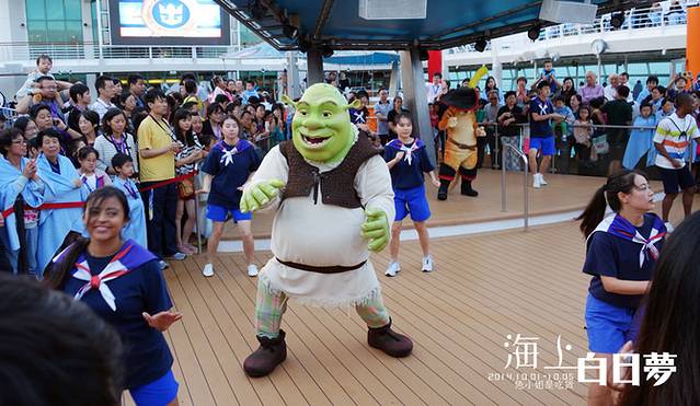 演出是由史瑞克、靴子猫、史瑞克老婆和船上的员工,带领大家一起跳简单的舞蹈。