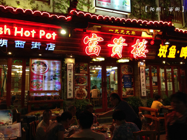 傍晚醒来准备出门找吃吃。一直觉着石斑鱼挺好吃的,所以到了桂林就想带着老婆去吃斑鱼火锅,原本计划去一家从别人攻略里找到的店吃,但老婆表示饿了,走不动了,就近吧。于是就就近去了富贵楼,那个传说中又一般又贵的店。