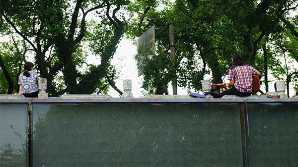 围墙上面貌似弹唱艺人,旁边的女人也貌似听得很认真~