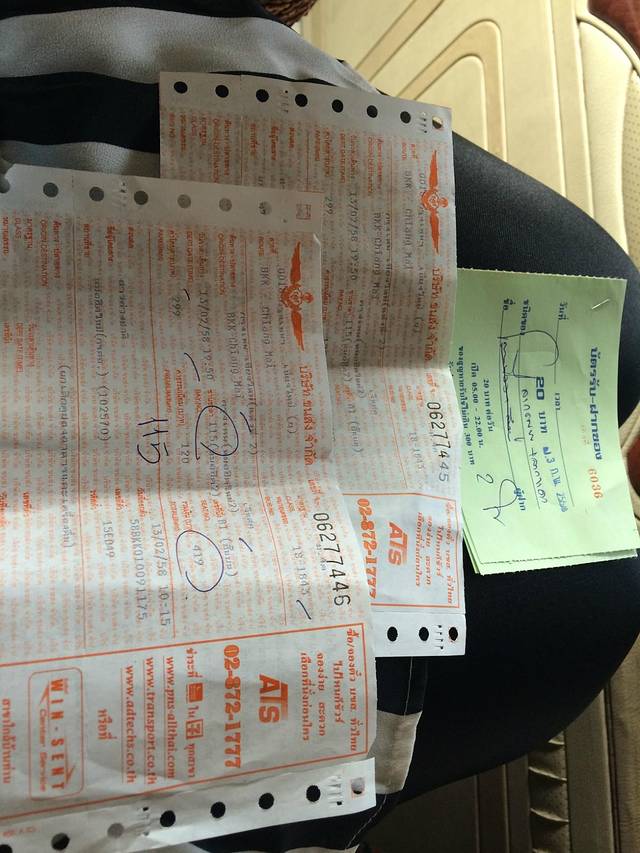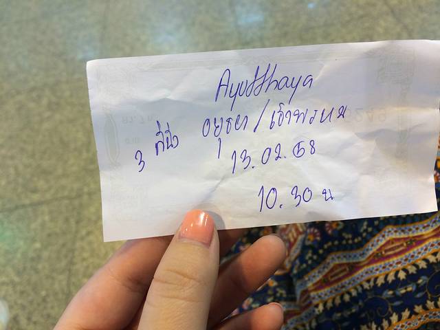 在车站我们先去买了到大城的汽车票,只给我们写了一张纸条,我们后来才发现,他把我们的行李也算了一个人的票,左边的那个3就是代表3个人的意思,这是我们后来从曼谷去芭提雅才有的觉悟。其实那天我们是捌行李寄存在车站的,因为我们晚上还要从这个车站出发去清迈。