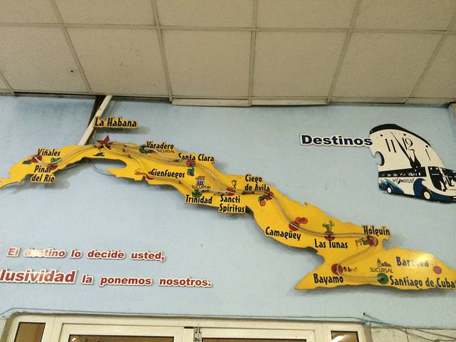 2月4号下午一点乘车前往圣地亚哥(Santiago de Cuba)需要提前半小时到一小时到车站,因为要像登机那样要先CHECK IN行李和票,然后再上车,因为他们办事都比较慢,所以早到会好一些。