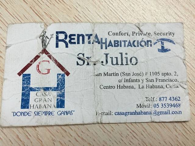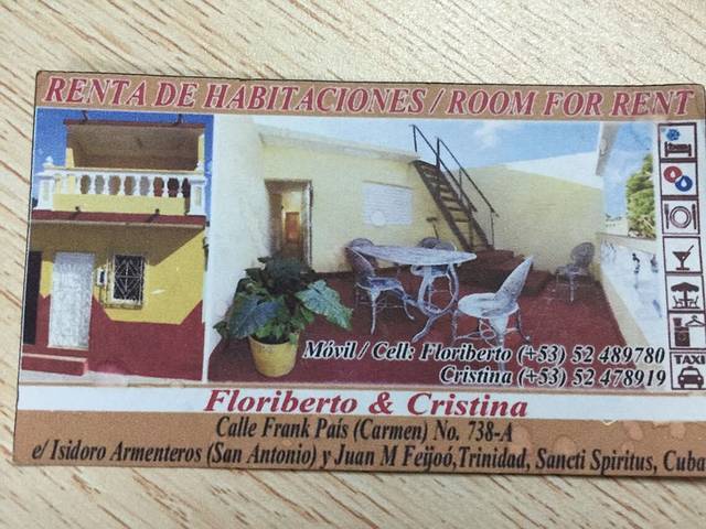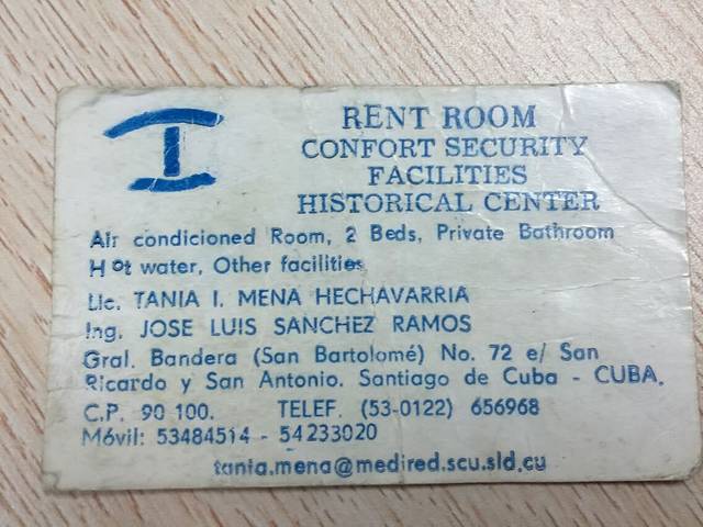 习惯了住宿随遇而安,所以没有提前预定住宿。古巴的星级酒店不用太过期待,即使五星级酒店你都会你让落差可以大到只有三星标准,可以考虑住当地人的旅店(CASA),这样不仅可以感受古巴当地人生活而且住宿也算干净舒适。通常CASA的主人都是把自己的房间改成住宿,所以一户人家的房间也就几间住房,之前说住宿会紧张,我想不是黄金旅游期大可不必担心。如何找CASA呢?墙上会画上一个类似蓝色眼睛的标示(如图)就是,古巴的大部分住宿都靠近广场之类的地方,所以尽量往历史老城区走就可以找到高中低档住宿,除哈瓦那之外的地方出车站就会有人多人举牌子问要不要住宿,古巴人虽然爱贪小便宜,但是人心不坏,即使你不照顾生意他们都会很乐意帮助你比如带你找住宿的地方,前提是你是一个愿意折腾的人。对于一个网络不发达的国家不建议说走就走的旅行,这样实在太任性,所以走之前我还是做了很多的功课。我在哈瓦那住的CASA对于短期停留者不推荐,因为从CASA步行进老城观光区需要30分钟,坐人力三轮车要3比索。可以在HOTEL PLAZA或者CHINA TOWN(中国城)或者四个大的PLAZA附近找住宿。虽然观光起来不方便但是住在我所住的CASA可以非常直观的感受当地人的生活,房子虽然简单,家里却收拾的非常干净,女主人每天都会帮我把衣服收好叠的很整齐的放床头,但有个问题是老板不会讲英文,只会西班牙语。名片和地址我会在下面贴出来。从图一到图三分别是哈瓦那,圣地亚哥和特立尼达的住宿,哈瓦那的住宿赶时间的话不太推荐,离观光区比较远。巴拉德罗的住宿在CALLE 36一栋不起眼的房子。价格分别是15比索.15比索.10比索.20比索