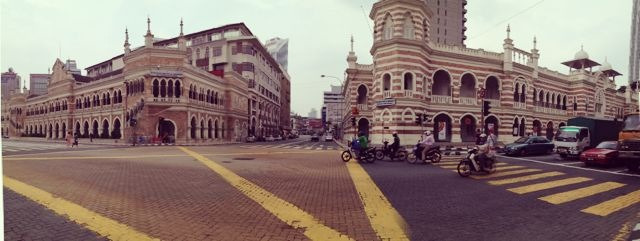 下了会雨,我们在苏丹阿都沙默楼躲雨,这栋楼是吉隆坡的标志建筑,最高法院所在地,设计独特,印度、阿拉伯风格综合在一起。它有一座高四十多米的钟楼,造型类似英国的大本钟,在钟楼的顶部加上了一个金色的半球形圆顶。