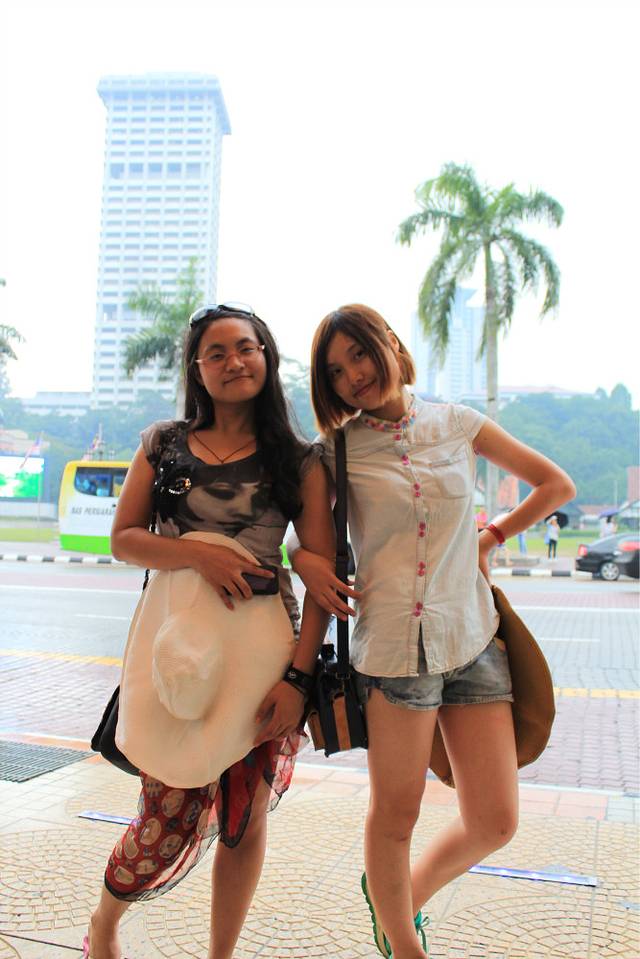 背景是国家清真寺,东南亚最大的清真寺,最大特色是星行的屋顶,象征一个独立国家的抱负。73米高的尖塔直指蓝天,是吉隆坡地标之一。穿的太清凉是不允许进入的。