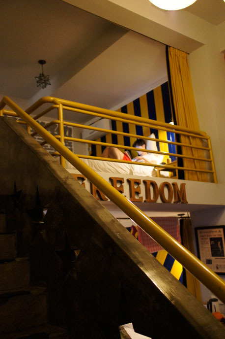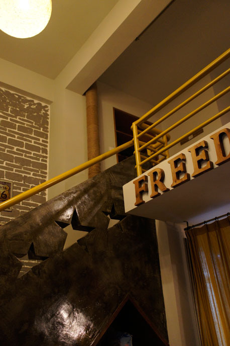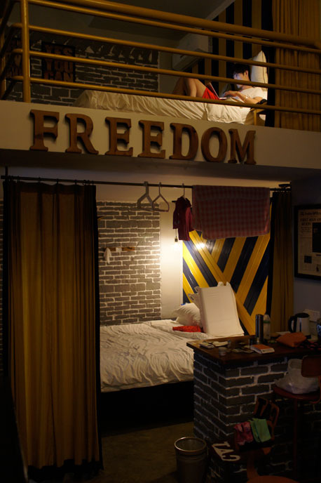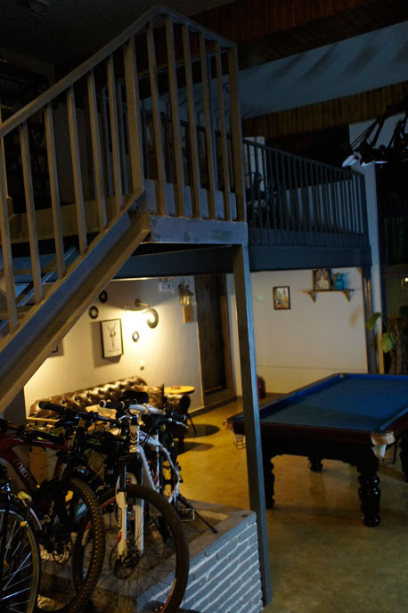 这个客栈公共区域有桌上足球还有桌球以及图书区域,一层有厨房,7层还有洗衣机,都可以免费使用,还有自行车,不过这个不知道是免费的还是收费的,反正很适合年轻人来玩儿。装修比较有特色,我们住的是一层的美国梦房间,上下层的loft,有点意思,适合一家人居住。一间一晚价格是438,去哪返65,于是价格下来是373,人均下来比定2间房划算!