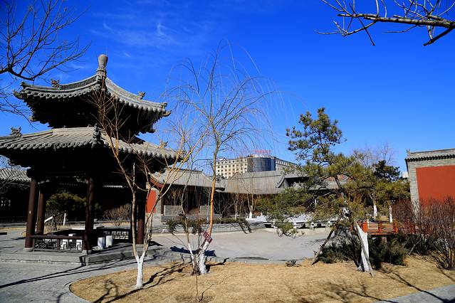 恍然大悟,打消吃饭念头,转乘38路公交车于16时到达位于市区的华严寺,门票48元。华严寺曾经是皇家寺庙,寺院的重要建筑是大雄宝殿和薄伽教藏殿,历史悠久且保存完好。是日天空湛蓝,夕阳下,寺院里的红墙绿瓦、枯木斜影都是拍摄题材。寺中有新建木塔一座,登高览全城;塔地宫纯铜包裹,彰显金贵。该寺院值得一览。