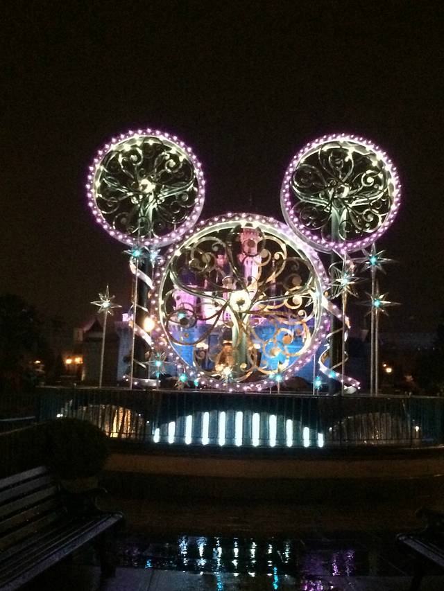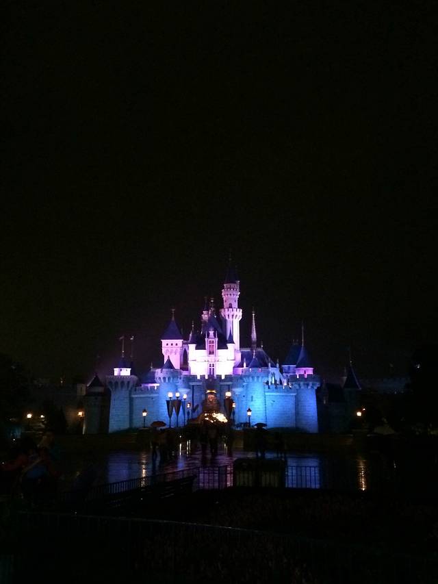 大雨完全没有变小或者要停的趋势,地面开始积起水了,很多游客也开始往出口走,我和芮还在坚持地等着。听到广播里说烟火表演将在15分钟后开始的时候,我们两个超级开心地往睡公主城堡走。