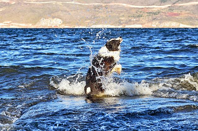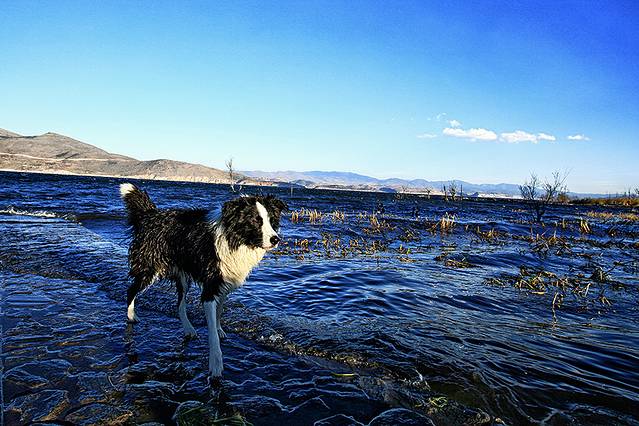 我们正在一个小码头合影留念的时候,这只牧羊犬好像每天都会光顾这里一样,在水里玩耍嬉戏,它冲进洱海的时候吸引了我们所有人的目光,被溅起来的水花被凝固住,好像时间就停止了一样。
