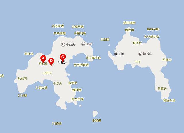 如上图:左边叫 枸杞,是一个乡级别行政编制,右边是嵊山镇,右边发达点,左边沙滩多,从海水蓝色程度来说,右边更好,那个东崖绝壁是整个枸杞岛最好的海水部分。 2个岛有大桥相连,所以我这里说的枸杞岛就是说2个岛总称。 图中C的部分,是大王沙滩部分,因为是一个湾,也是最大的沙滩,所以住这里的人比较多。 住宿建议住大王或者嵊山岛。