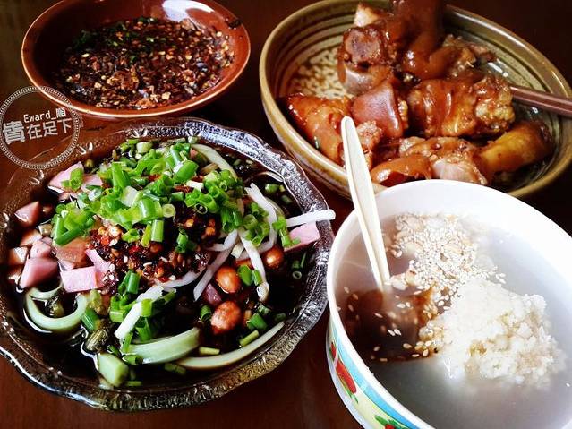 左下角是米豆腐,右下角是糕粑稀饭,右上角是青岩猪蹄!