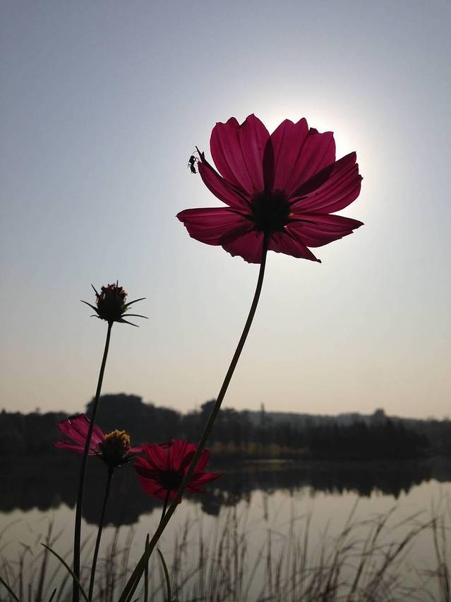 如果你俯身向身边花丛中细细探寻,还会发现蝴蝶、七星瓢虫、蚂蚱、蛐蛐儿、蚂蚁,以及一些你叫不上名字的昆虫,它们都很认真地忙碌着,甚至为了你不小心掉下的一丁点儿饼干屑而大战一场呢。哇,原来安静的湖畔还藏着这样一个小世界!你好像回到了无忧无虑的童年时光。