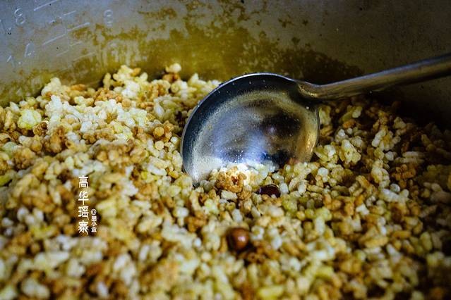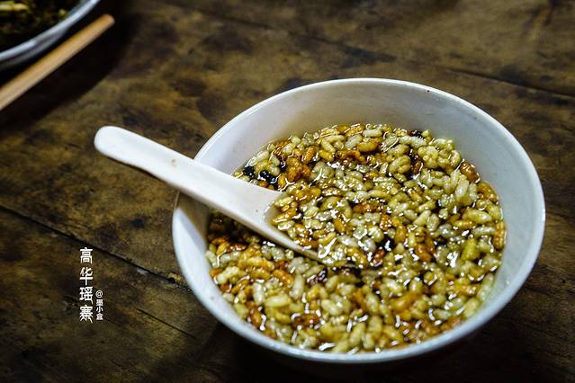 出浴后,面色特别红润,身体放轻很多,整个人都神清气爽了,想来泡一次就这般效果,如果再多来几次那真是美翻了,坐在小板凳上,任微风吹来,拨弄着湿嗒嗒的头发,阿姨端来了一碗油茶,还没入口,香味就已经扑鼻了,正好消耗了的体力需要补回来,于是几大口,一碗就已经被消灭掉,阿姨又热情的盛上第二碗,这油茶是瑶寨里比较独特的美食,是要把煮好的糯米饭晒干,用油爆成米花,用容器装起来,要喝油茶的时候,就盛些米花在碗里,再用油炒一下茶叶,加水煮上一煮,然后就把这汤汁倒进碗里,少放一点盐,搅拌一下,一碗色香味俱全的油茶就齐活了。