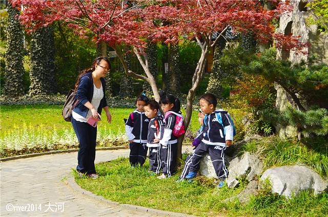 春光明媚的日子,也是小学生游园的日子,小朋友在老师的指挥下排成一列,面带笑容并喊着“茄子”。