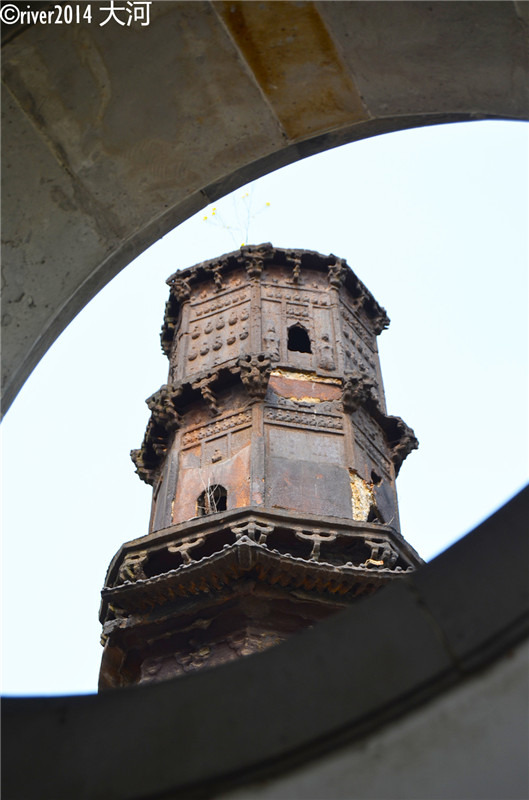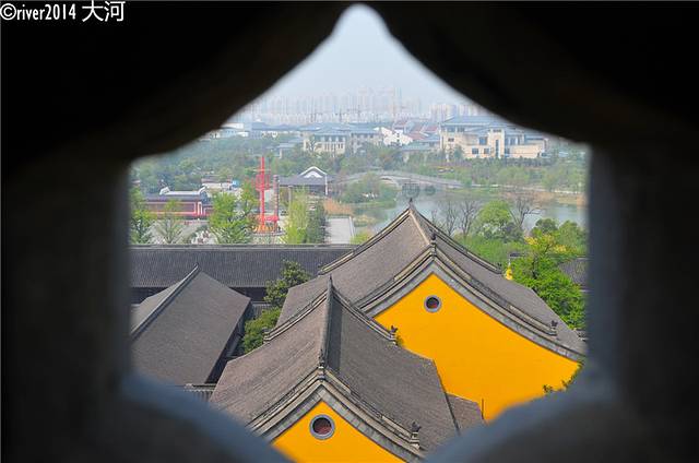登塔时透过厚厚的石质窗户,寺庙的殿堂排列整齐,颇具气势。
