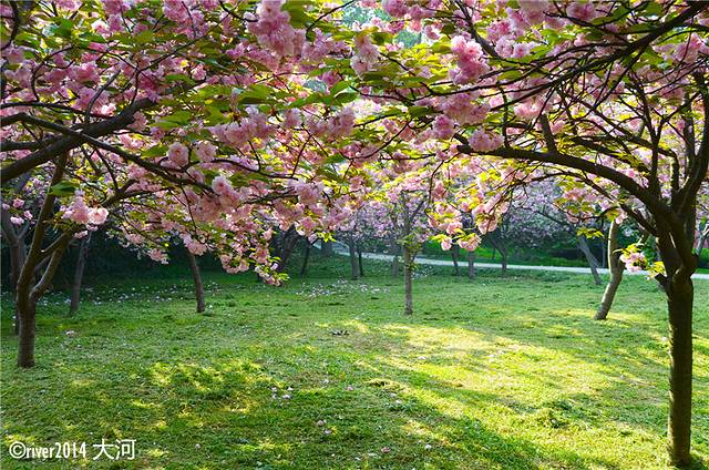 宝塔山公园的樱花林,一株株樱花枝叶铺展连在一起如同形成了一座樱花帐篷。