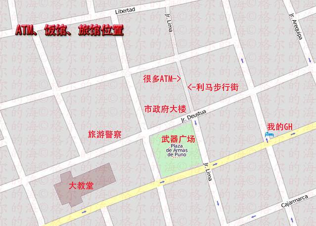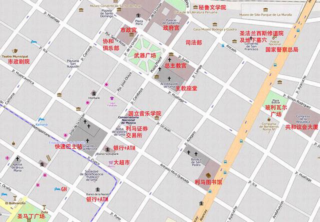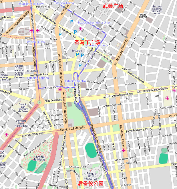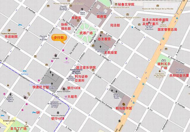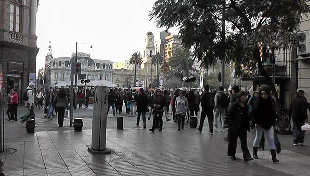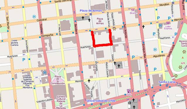 出了教堂,我们沿着广场边上的Paseo Ahumada步行街走了一会儿,然后拐到paseo huerfanos步行街,再拐到Paseo Estador步行街走回广场。见下图的红色线条部分。