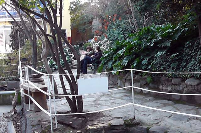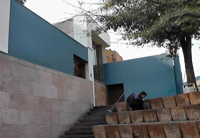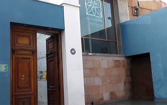 从山上下来后,我们走去聂鲁达的故居(La Chascona)。离城市公园大门口也就3百米的路程。这条石子街上洒落着山上飘落的枯黄树叶,踩着这些树叶,拐过两道弯,就进了一条狭窄的小巷。小巷的尽头就是大诗人的故居。