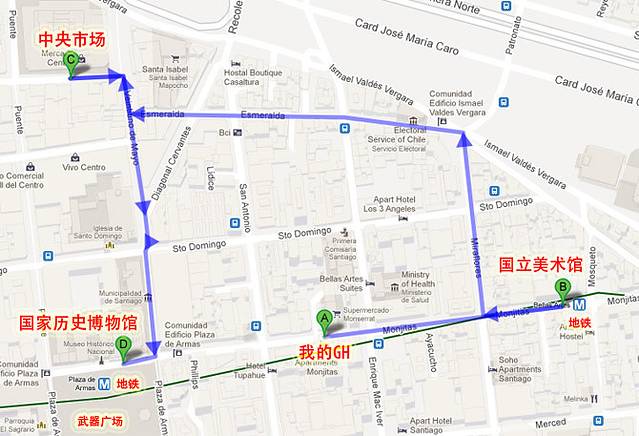 今天去了三个景点,同时沿途步行,体验本地风土人情。这三个景点是国立美术馆、圣地亚哥中央市场和国家历史博物馆。都在容易步行到达的范围。从GH(A)走去美术馆280米;美术馆(B)到市场800米;市场(C)至历史博物馆(D)450米。