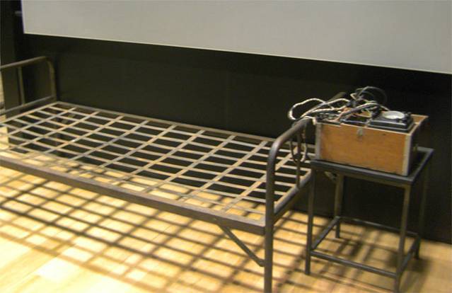 这张用来折磨人的铁床,让我想起在柬埔寨S21集中营里看到的几乎一抹一样的铁床。。。。。。通上电,瞅着被折磨的同类在那里上下翻腾挣扎、惨叫。。。。。。人性啊,人性!
