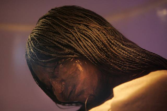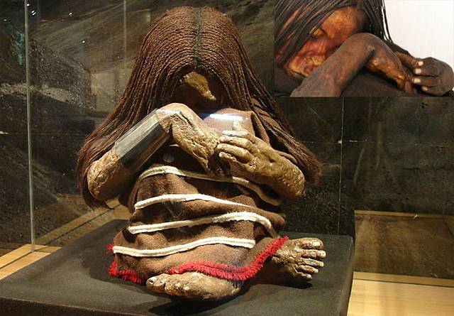 进馆之后,要看一看镇馆之宝“冰男孩”(The boy's frozen body of Cerro El Plomo 或者 La Momia del Cerro El Plomo)这个冰男孩据说是智利发现的第一个,地点在海拔5400米的El Plomo山上。这座山就在santiago附近。发现的时间是1954年。El Plomo山上的气温常年维持在2-4摄氏度之间,相对湿度42%-45%,是非常适合冷藏肉体的环境。我在秘鲁高原那篇游记里也提到过秘鲁的博物馆展出的冰女孩,和这个冰男孩一样,都是印加人当初向他们信奉的山神祭献的礼物。据考古分析,这个冰男孩也是被奇查酒灌醉后,放置在山顶的。。。。。。他们把小男孩的脸用赭色矿石涂成红色,把头发扎成200多条小辫子。说到辫子,我又想起以前读到印加历史里描写印加妇女洗、梳辫子的细节。她们先用放了10天左右的尿液洗头发,然后精心编结一个个辫子。最后,再用同样的尿液刷在头发和辫子上,定型。
