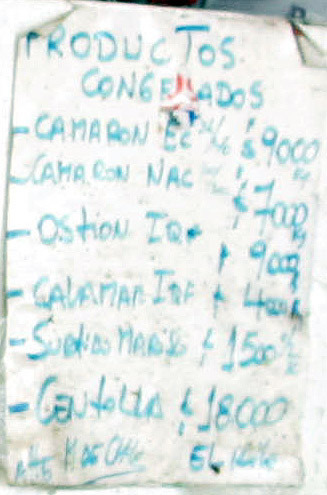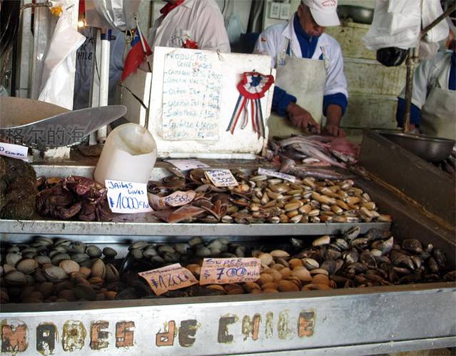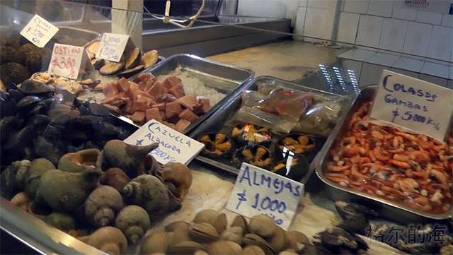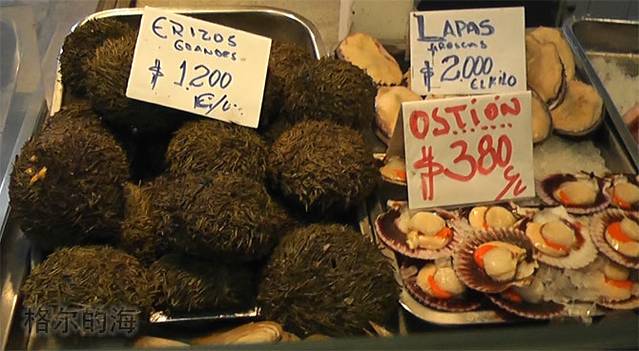 看看这鲜美的扇贝(Ostion)。。。。。。左边是海胆(Erizos),右后方的帽贝(Lapas)论公斤才4美元。