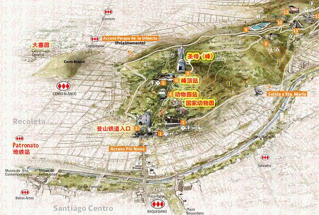 城市公园是Santiago人休闲、娱乐和徒步的好去处,除了我乘坐登山铁道(Funicular)要去的圣母峰(Virgen cumbre)之外,还有大花园、餐馆、游泳池、体育设施等,如有时间,可以在这个安第斯山支脉徒步或露营。景色优美。