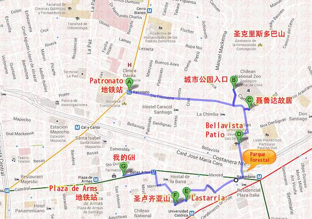 今天打算去城市公园、圣克里斯多巴山和聂鲁达故居,然后经由Bellavista Patio去Lastarria,再经圣卢奇亚山返回GH。这就够走上一天的了。