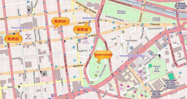 值得一提的是,Valdivia建城仪式的举行地点就是Cerro Santa Lucía。Cerro 西语意为山。1541年12月13日Valdivia攻克这座山,那天正好是天主教庆祝Santa Lucía诞辰日。这个景点基本上去圣地亚哥的游客都会去一下。圣地亚哥城以Cerro Santa Lucía这座小山为中心发展到今天。115楼的地图显示Cerro Santa Lucía的位置。它离我们的GH很近,也离中心广场Plaza de Armas很近。
