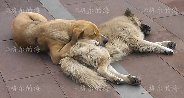 流浪狗在寒冷的天气里相依相偎、睡得很香