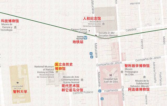 今天晚上就要飞回悉尼了。抓紧时间在santiago多看看。早早吃过早餐,向武器广场地铁站出发。计划去人权纪念馆那里,同时也参观另外几家博物馆,然后去Centro Artesanal工艺品市场。这里有张地图,显示有不少博物馆在人权馆附近。在Quinta Normal地铁站下车,马路对面就是人权馆。