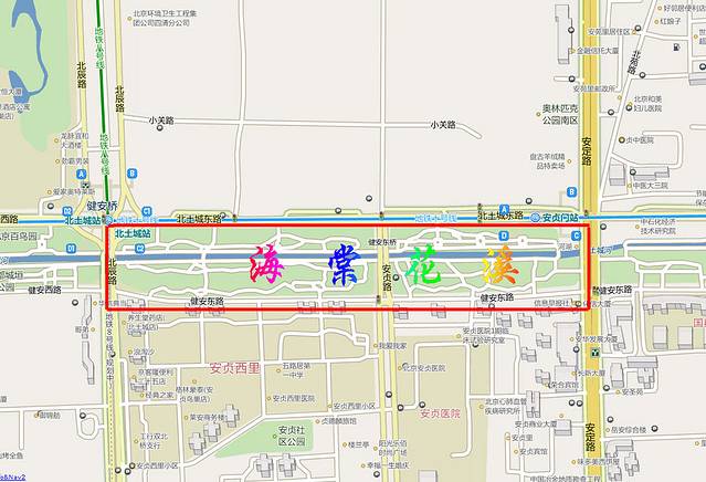 事先查地图了解到要乘10号线在北土城站下车,问过站内工作人员得知从C2出口出站可以直接进入公园。从网上截了一张地图,我用红色圈出的地带就是土城公园里的海棠花溪,除了地铁113、21、380、694、特2路在北土城西路东口或是安贞西里下车都能到,交通很方便吧!