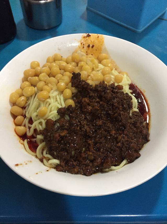 豌杂面,就是豌豆杂酱面,要拌匀了才好吃,我都要拌好久,面只有一点点辣