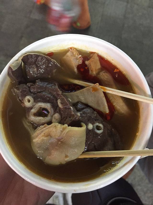 酒店旁边的夜市,是一条街,虽说是夜市,有些店10点多就关了,吃的很多,但是也有人说不太正宗,不过我不懂啦,有的吃就吃啦,吃了牛杂,好又来酸辣粉,凉膏,酸辣粉就是很多游记推荐的那个好又来,好吃,味道很浓,6块钱还有肉末真的很便宜,比上海的好吃。凉膏还蛮特别的,以前没吃过,感觉应该很清火吧,上面白的是酒酿,下面黑的我也不知道是啥,牛杂一般