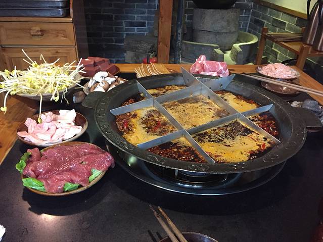 3点左右才去机场出来,然后就放擦头直奔酒店了,重庆的擦头还蛮多的,排了一会就上车了,出租车的后备箱不大,只能放一个28寸的行李箱,我还有个小点的就放座位上了。从机场到日月光,你就能充分的体会了到重庆为什么叫山城,路一会上坡一会下坡,我也是醉了,重庆的路不是谁都能开。到了酒店办好入住,去房间里休息了一会,老板还很贴心的发短信告诉我们什么好吃,然后我们就去吃火锅啦!来重庆吧第一次火锅很期待。第一顿吃的是味蒸老火锅,离住的地方挺近的,大概走路10分钟不到吧。进去以后店员问我们吃鸳鸯还是老火锅,来重庆肯定是吃老火锅了,看了那个锅你就发现和上海那些重庆火锅完全不一样的,里面都是一大块一大块的牛油,直接在你的面前煮,吃的时候滴下来,在桌子上就会结一层油。推荐鸭血,毛肚,鸭肠,猪黄喉比牛黄喉好吃,因为我咬不动牛黄喉,也可能是我牙不好。饮料点了唯怡,好像是重庆的特色花生奶,很解辣,好喝,后面每天都要喝