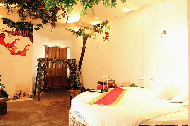 无锡布拉格体验酒店位于蠡湖中央公园内,是一家设计独特有创意的酒店。类似罗马斗兽场的圆形建筑内,包含了中央展厅和风格迥异的的主题客房。我和苑苑都是重口味,选择的是豪华丛林房。古堡,枯藤,木床,我们这是要去丛林探险麽,嚯嚯~