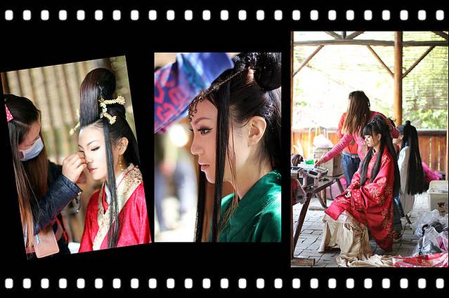 早上九点,化妆师便开始给来自全国各地的MM穿戴服饰,头饰,化妆。一共8个“演员”,4个摄影师,分成4组,2人一组,一般每人服饰3套。午餐10元盒饭,须预定且周围无其他餐饮。餐后,待全部MM装束完毕,坐面包车集体出发。(我深刻地体会了从事演艺行业的艰辛,并很好的扮演了经纪人的角色,穿鞋递水打发各个要求合照签名的“粉丝”。。其实这个恶人是小太阳)